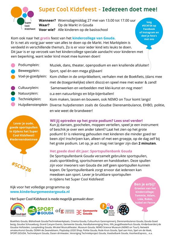 Het Super Cool Kidsfeest is het afscheidsfeestje van het kindercollege. Ieder jaar treedt er een nieuw kindercollege aan en neemt het oude afscheid. Tijdens dit gratis feest is er van alles te doen en te beleven voor alle kinderen in Gouda, vormgegeven naar de plannen van de leden van het college, onder begeleiding van de Brede School Gouda en gemeente Gouda.