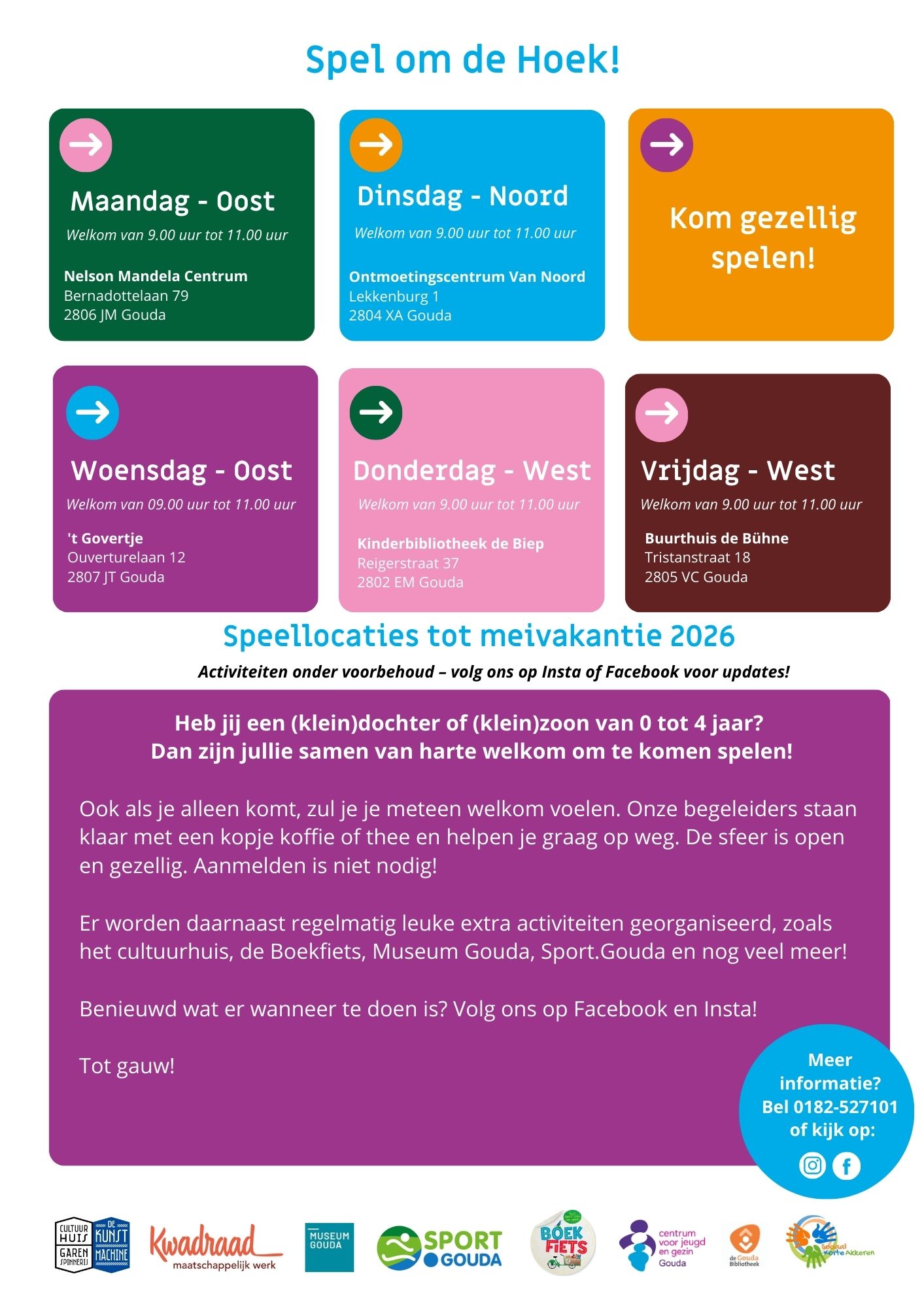 Elke locatie van ‘Spel om de hoek’ is speciaal voor de kinderen ingericht. Er staat uitdagend speelgoed passend bij de leeftijd van de kinderen. Dit spel wordt begeleid door vrijwilligers.